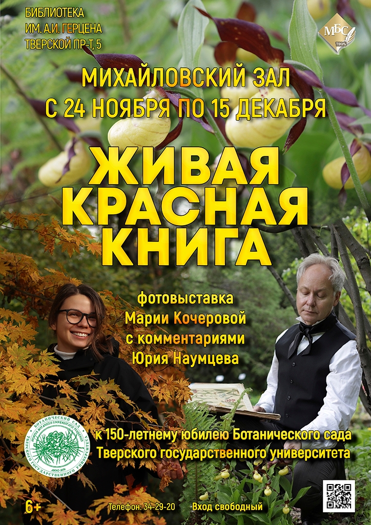 Друзья, приглашаем Вас на ФОТОВЫСТАВКУ «ЖИВАЯ КРАСНАЯ КНИГА» , посвященную 150-ЛЕТИЮ БОТАНИЧЕСКОГО САДА ТВЕРСКОГО ГОСУДАРСТВЕННОГО УНИВЕРСИТЕТА, которая пройдет с 24 ноября по 15 декабря в Библиотеке им. А.И. Герцена (Тверской проспект, 5) - Михайловский зал.